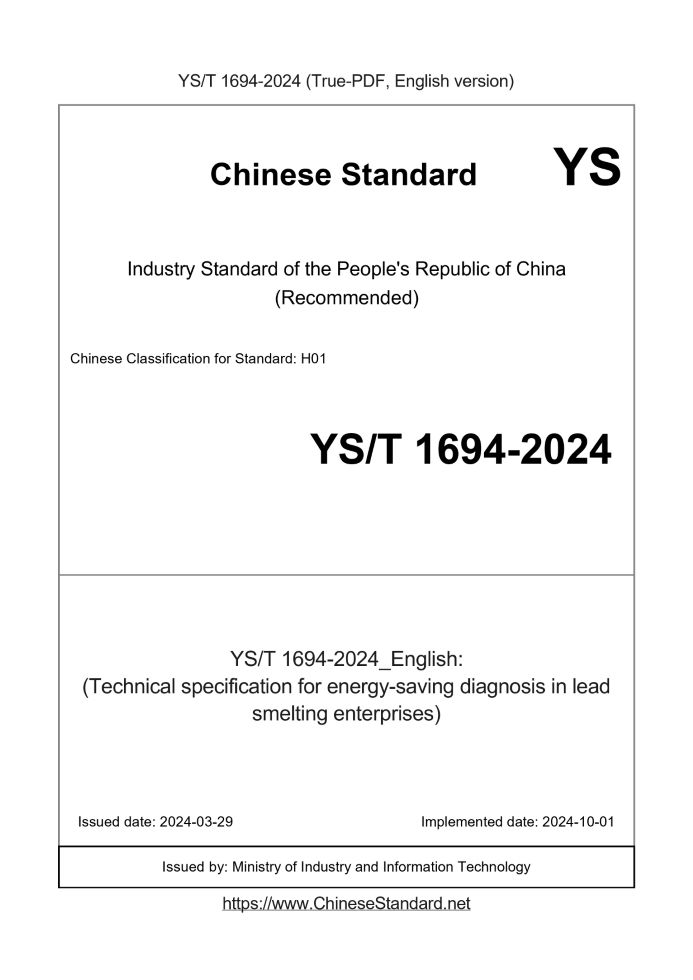 Delivery: <= 4 days. True-PDF full-copy in English will be manually translated and delivered via email. YS/T 1694-2024: (Technical specification for energy-saving diagnosis in lead smelting enterprises) Status: Valid