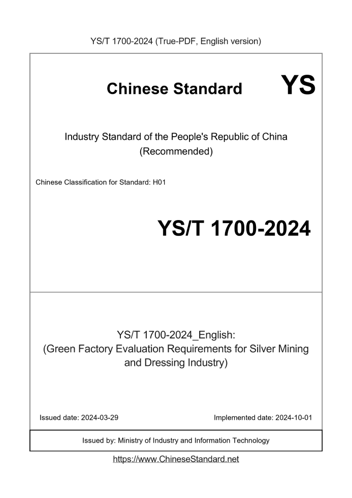 Delivery: <= 6 days. True-PDF full-copy in English will be manually translated and delivered via email. YS/T 1700-2024: (Green Factory Evaluation Requirements for Silver Mining and Dressing Industry) Status: Valid