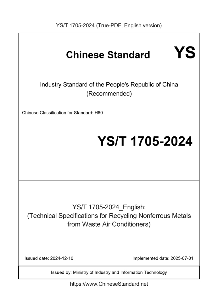 Basic dataStandard ID: YS/T 1705-2024 (YS/T1705-2024)Description (Translated English): (Technical Specifications for Recycling Nonferrous Metals from Waste Air Conditioners) Sector / Industry: Nonferrous Metallurgy Industry Standard (Recommended) Classification of Chinese Standard: H60 Classification of International Standard: 77.120.01 Date of Issue: 2024-12-10 Date of Implementation: 2025-07-01 Issuing agency(ies): Ministry of Industry and Information Technology Summary: This standard specifies the technical requirements and environmental protection requirements for the recovery of non-ferrous metals in waste air conditioners. This standard applies to the recovery of non-ferrous metals in waste household, waste commercial air conditioners and waste automobile air conditioners. Tips & Frequently Asked Questions:Question 1: How long will the true-PDF of YS/T 1705-2024_English be delivered?Answer: Upon your order, we will start to translate YS/T 1705-2024_English as soon as possible, and keep you informed of the progress. The lead time is typically 1 ~ 3 working days. The lengthier the document the longer the lead time.Question 2: Can I share the purchased PDF of YS/T 1705-2024_English with my colleagues?Answer: Yes. The purchased PDF of YS/T 1705-2024_English will be deemed to be sold to your employer/organization who actually pays for it, including your colleagues and your employer's intranet.Question 3: Does the price include tax/VAT?Answer: Yes. Our tax invoice, downloaded/delivered in 9 seconds, includes all tax/VAT and complies with 100+ countries' tax regulations (tax exempted in 100+ countries) -- See Avoidance of Double Taxation Agreements (DTAs): List of DTAs signed between Singapore and 100+ countriesQuestion 4: Do you accept my currency other than USD?Answer: Yes. If you need your currency to be printed on the invoice, please write an email to Sales@ChineseStandard.net. In 2 working-hours, we will create a special link for you to pay in any currencies. Otherwise, follow the normal steps: Add to Cart -- Checkout -- Select your currency to pay. |