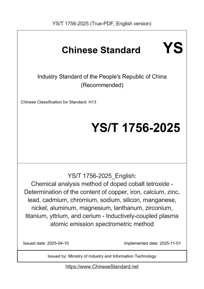 Basic dataStandard ID: YS/T 1756-2025 (YS/T1756-2025)Description (Translated English): Chemical analysis method of doped cobalt tetroxide - Determination of the content of copper, iron, calcium, zinc, lead, cadmium, chromium, sodium, silicon, manganese, nickel, aluminum, magnesium, lanthanum, zirconium, titanium, yttrium, and cerium - Inductively-coupled plasma atomic emission spectrometric method Sector / Industry: Nonferrous Metallurgy Industry Standard (Recommended) Classification of Chinese Standard: H13 Classification of International Standard: 77.120.70 Date of Issue: 2025-04-10 Date of Implementation: 2025-11-01 Issuing agency(ies): Ministry of Industry and Information Technology Summary: This standard specifies the determination method for the content of copper, iron, calcium, zinc, lead, cadmium, chromium, sodium, silicon, manganese, nickel, aluminum, magnesium, lanthanum, zirconium, titanium, yttrium, and cerium in doped cobalt tetroxide. This document applies to the determination of the content of copper, iron, calcium, zinc, lead, cadmium, chromium, sodium, silicon, manganese, nickel, aluminum, magnesium, lanthanum, zirconium, titanium, yttrium, and cerium in doped cobalt tetroxide. Tips & Frequently Asked Questions:Question 1: How long will the true-PDF of YS/T 1756-2025_English be delivered?Answer: Upon your order, we will start to translate YS/T 1756-2025_English as soon as possible, and keep you informed of the progress. The lead time is typically 1 ~ 3 working days. The lengthier the document the longer the lead time.Question 2: Can I share the purchased PDF of YS/T 1756-2025_English with my colleagues?Answer: Yes. The purchased PDF of YS/T 1756-2025_English will be deemed to be sold to your employer/organization who actually pays for it, including your colleagues and your employer's intranet.Question 3: Does the price include tax/VAT?Answer: Yes. Our tax invoice, downloaded/delivered in 9 seconds, includes all tax/VAT and complies with 100+ countries' tax regulations (tax exempted in 100+ countries) -- See Avoidance of Double Taxation Agreements (DTAs): List of DTAs signed between Singapore and 100+ countriesQuestion 4: Do you accept my currency other than USD?Answer: Yes. If you need your currency to be printed on the invoice, please write an email to Sales@ChineseStandard.net. In 2 working-hours, we will create a special link for you to pay in any currencies. Otherwise, follow the normal steps: Add to Cart -- Checkout -- Select your currency to pay. |