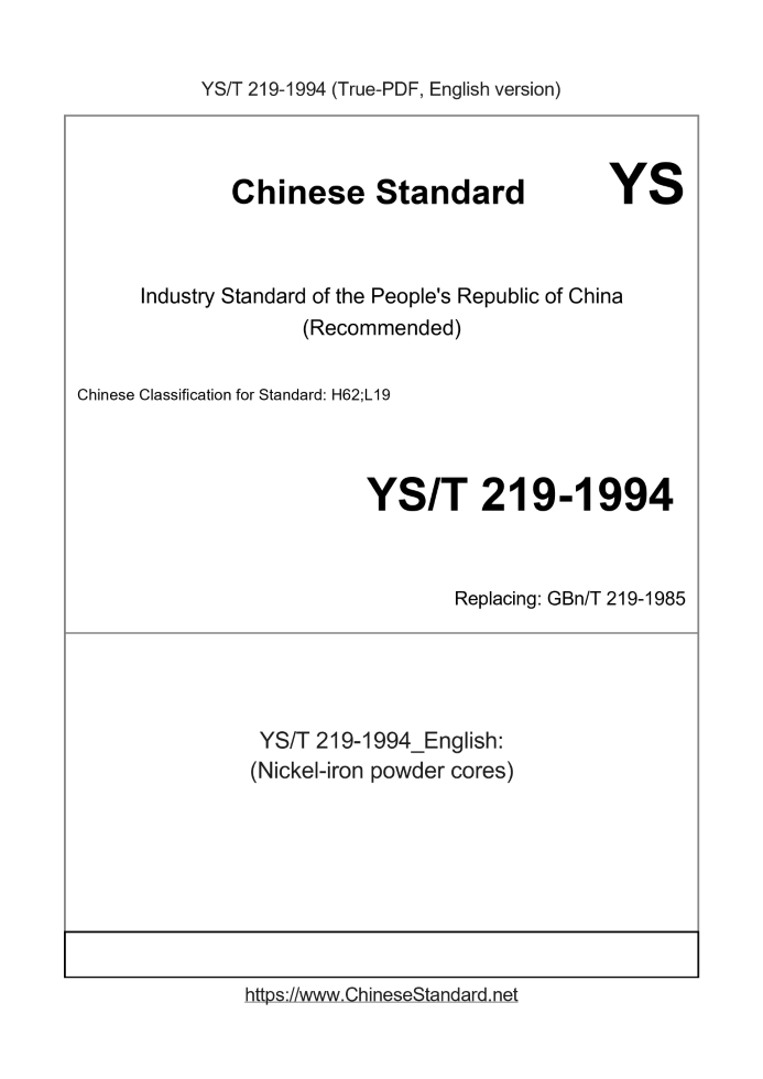 Delivery: <= 3 days. True-PDF full-copy in English will be manually translated and delivered via email. YS/T 219-1994: (Nickel-iron powder cores) Status: Obsolete