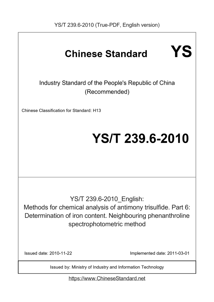 Delivery: <= 3 days. True-PDF full-copy in English will be manually translated and delivered via email. YS/T 239.6-2010: Methods for chemical analysis of antimony trisulfide. Part 6: Determination of iron content. Neighbouring phenanthroline spectrophotometric method