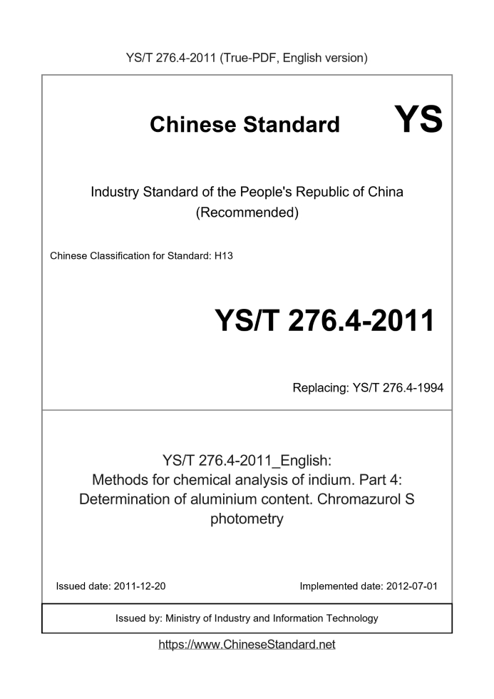 Delivery: <= 3 days. True-PDF full-copy in English will be manually translated and delivered via email. YS/T 276.4-2011: Methods for chemical analysis of indium. Part 4: Determination of aluminium content. Chromazurol S photometry Status: Valid