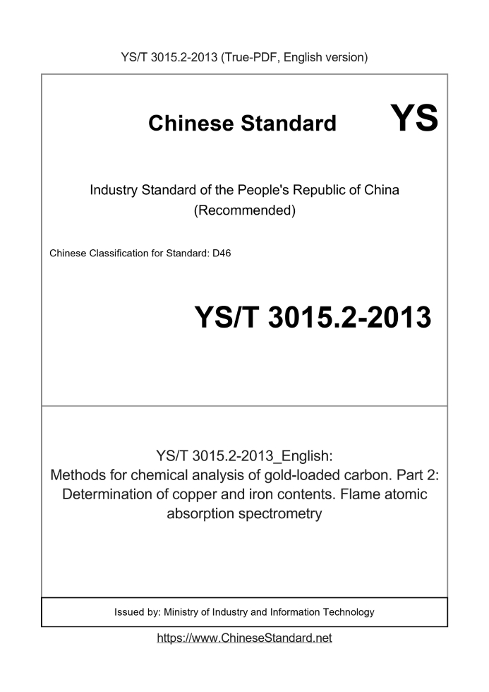 Delivery: <= 3 days. True-PDF full-copy in English will be manually translated and delivered via email. YS/T 3015.2-2013: Methods for chemical analysis of gold-loaded carbon. Part 2: Determination of copper and iron contents. Flame atomic absorption spectrometry Status: Valid