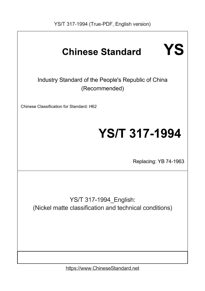 Delivery: <= 2 days. True-PDF full-copy in English will be manually translated and delivered via email. YS/T 317-1994: (Nickel matte classification and technical conditions) Status: Obsolete