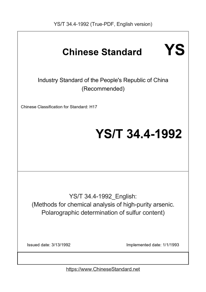 Delivery: <= 2 days. True-PDF full-copy in English will be manually translated and delivered via email. YS/T 34.4-1992: (Methods for chemical analysis of high-purity arsenic. Polarographic determination of sulfur content) Status: Obsolete