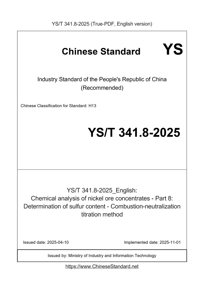 Basic dataStandard ID: YS/T 341.8-2025 (YS/T341.8-2025)Description (Translated English): Chemical analysis of nickel ore concentrates - Part 8: Determination of sulfur content - Combustion-neutralization titration method Sector / Industry: Nonferrous Metallurgy Industry Standard (Recommended) Classification of Chinese Standard: H13 Classification of International Standard: 77.040.30 Date of Issue: 2025-04-10 Date of Implementation: 2025-11-01 Issuing agency(ies): Ministry of Industry and Information Technology Summary: This standard specifies the method for determining the sulfur content in nickel concentrate. This document applies to the determination of sulfur content in nickel concentrate with a fluorine content of less than 0.50%, with a determination range of 10.00% to 40.00%. Tips & Frequently Asked Questions:Question 1: How long will the true-PDF of YS/T 341.8-2025_English be delivered?Answer: Upon your order, we will start to translate YS/T 341.8-2025_English as soon as possible, and keep you informed of the progress. The lead time is typically 1 ~ 3 working days. The lengthier the document the longer the lead time.Question 2: Can I share the purchased PDF of YS/T 341.8-2025_English with my colleagues?Answer: Yes. The purchased PDF of YS/T 341.8-2025_English will be deemed to be sold to your employer/organization who actually pays for it, including your colleagues and your employer's intranet.Question 3: Does the price include tax/VAT?Answer: Yes. Our tax invoice, downloaded/delivered in 9 seconds, includes all tax/VAT and complies with 100+ countries' tax regulations (tax exempted in 100+ countries) -- See Avoidance of Double Taxation Agreements (DTAs): List of DTAs signed between Singapore and 100+ countriesQuestion 4: Do you accept my currency other than USD?Answer: Yes. If you need your currency to be printed on the invoice, please write an email to Sales@ChineseStandard.net. In 2 working-hours, we will create a special link for you to pay in any currencies. Otherwise, follow the normal steps: Add to Cart -- Checkout -- Select your currency to pay. |