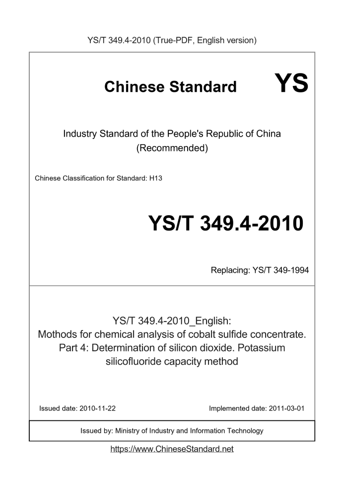 Delivery: <= 3 days. True-PDF full-copy in English will be manually translated and delivered via email. YS/T 349.4-2010: Mothods for chemical analysis of cobalt sulfide concentrate. Part 4: Determination of silicon dioxide. Potassium silicofluoride capacity method Status: Valid