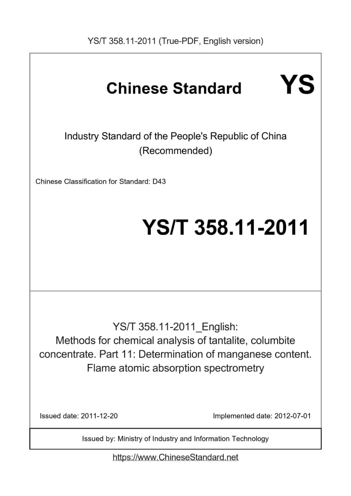 Delivery: <= 3 days. True-PDF full-copy in English will be manually translated and delivered via email. YS/T 358.11-2011: Methods for chemical analysis of tantalite, columbite concentrate. Part 11: Determination of manganese content. Flame atomic absorption spectrometry Status: Valid