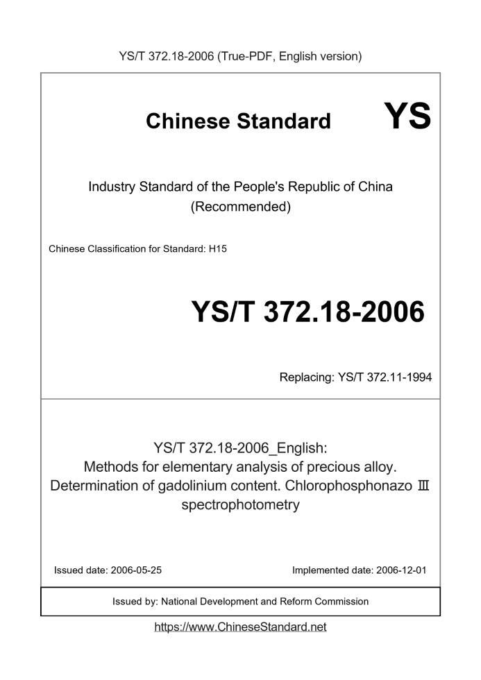 Delivery: <= 2 days. True-PDF full-copy in English will be manually translated and delivered via email. YS/T 372.18-2006: Methods for elementary analysis of precious alloy. Determination of gadolinium content. Chlorophosphonazo Ⅲ spectrophotometry