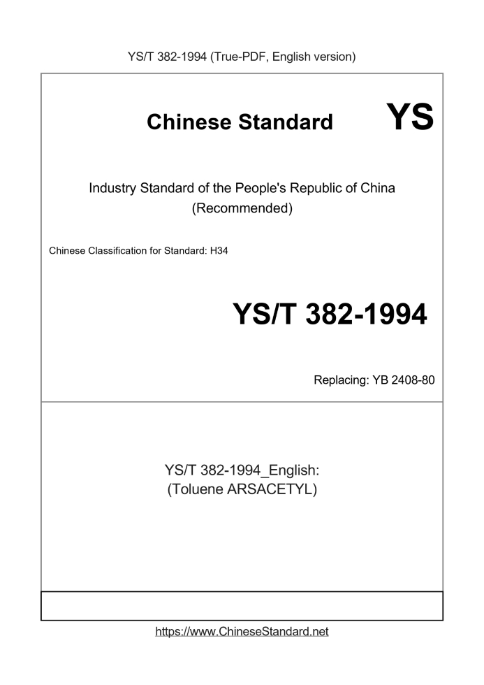 Delivery: <= 2 days. True-PDF full-copy in English will be manually translated and delivered via email. YS/T 382-1994: (Toluene ARSACETYL) Status: Obsolete