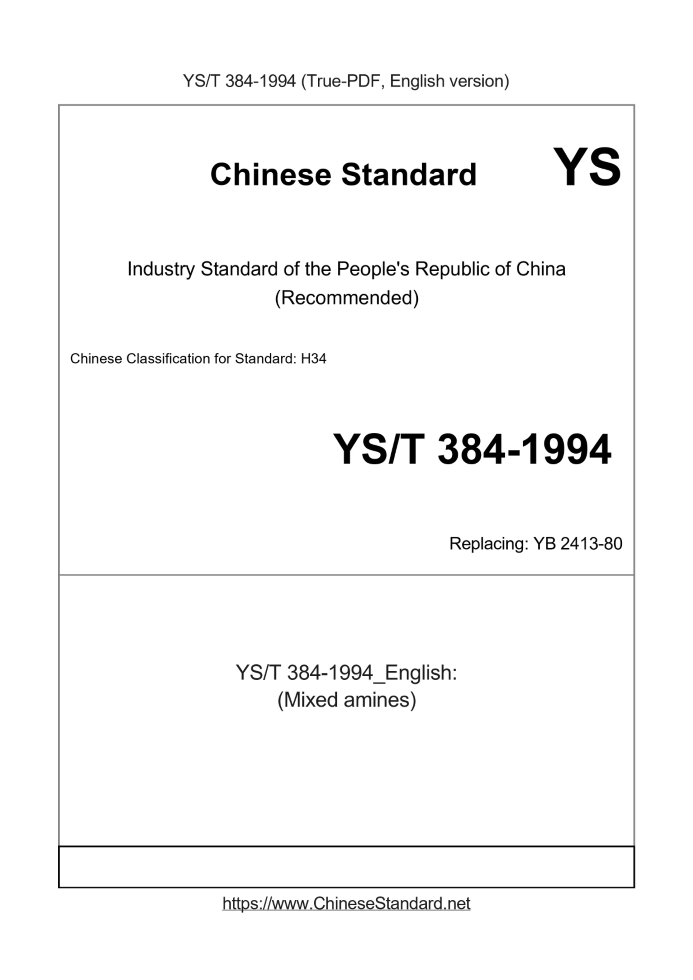 Delivery: <= 2 days. True-PDF full-copy in English will be manually translated and delivered via email. YS/T 384-1994: (Mixed amines) Status: Obsolete