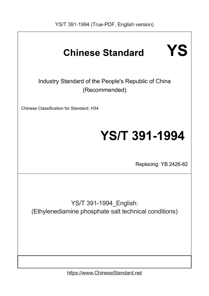 Delivery: <= 2 days. True-PDF full-copy in English will be manually translated and delivered via email. YS/T 391-1994: (Ethylenediamine phosphate salt technical conditions) Status: Obsolete