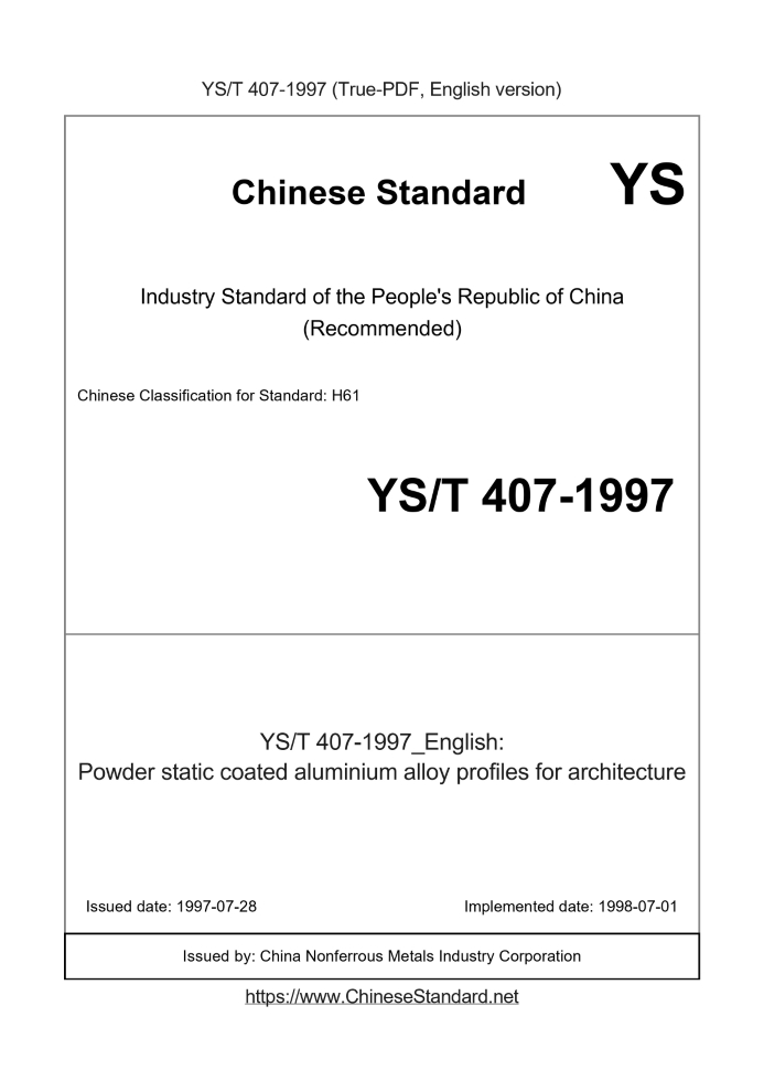 Delivery: <= 3 days. True-PDF full-copy in English will be manually translated and delivered via email. YS/T 407-1997: Powder static coated aluminium alloy profiles for architecture Status: Obsolete