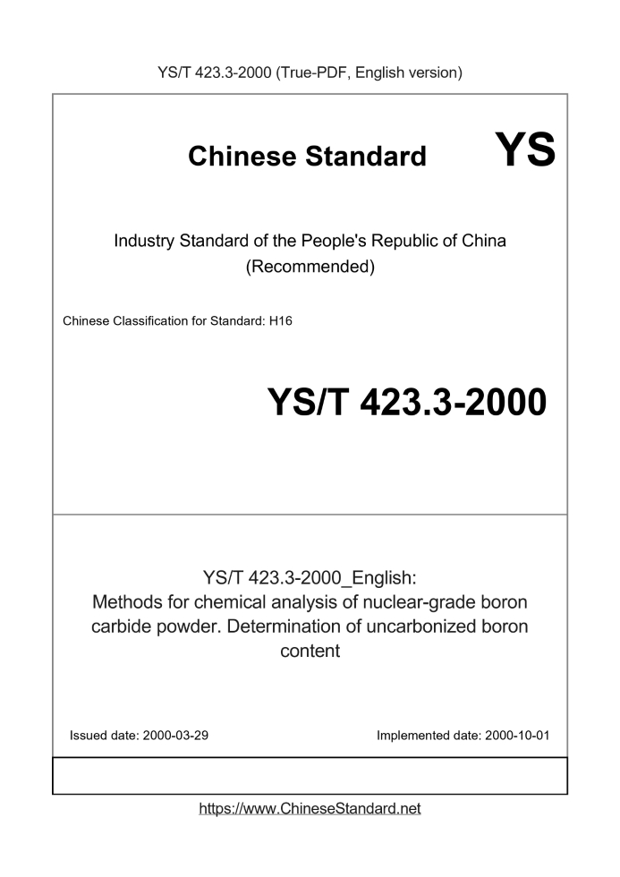Delivery: <= 2 days. True-PDF full-copy in English will be manually translated and delivered via email. YS/T 423.3-2000: Methods for chemical analysis of nuclear-grade boron carbide powder. Determination of uncarbonized boron content