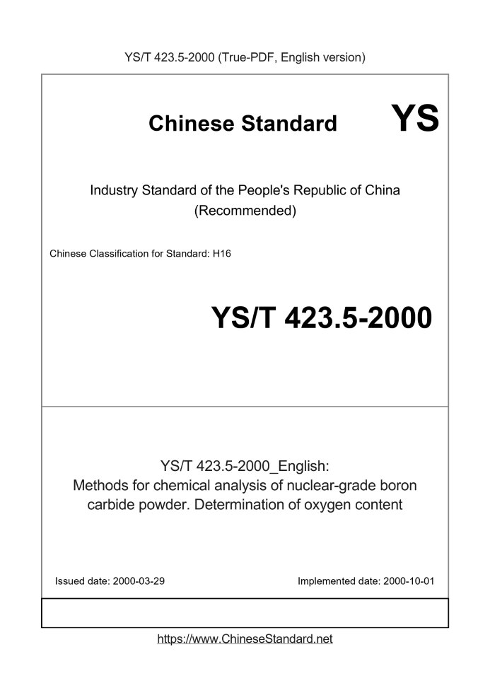 Delivery: <= 2 days. True-PDF full-copy in English will be manually translated and delivered via email. YS/T 423.5-2000: Methods for chemical analysis of nuclear-grade boron carbide powder. Determination of oxygen content