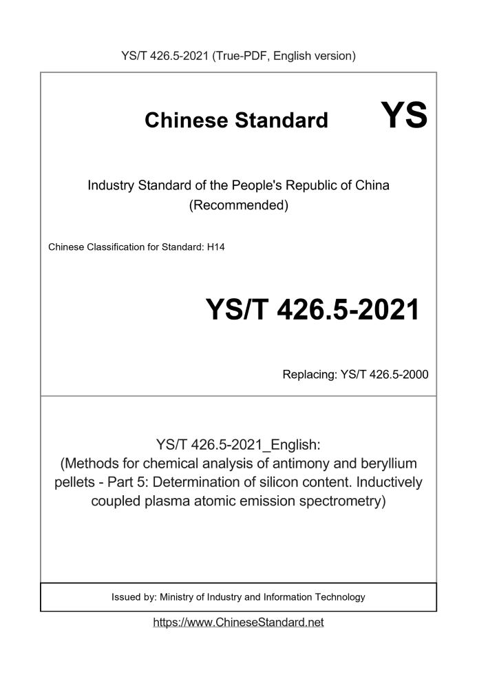 Delivery: <= 3 days. True-PDF full-copy in English will be manually translated and delivered via email. YS/T 426.5-2021: (Methods for chemical analysis of antimony and beryllium pellets - Part 5: Determination of silicon content. Inductively coupled plasma atomic emission spectrometry) Status: Valid YS/T 426.5: Historical versions
