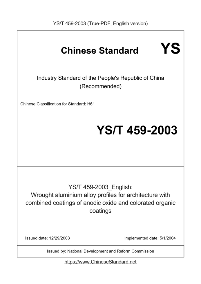 Delivery: <= 2 days. True-PDF full-copy in English will be manually translated and delivered via email. YS/T 459-2003: Wrought aluminium alloy profiles for architecture with combined coatings of anodic oxide and colorated organic coatings Status: Obsolete