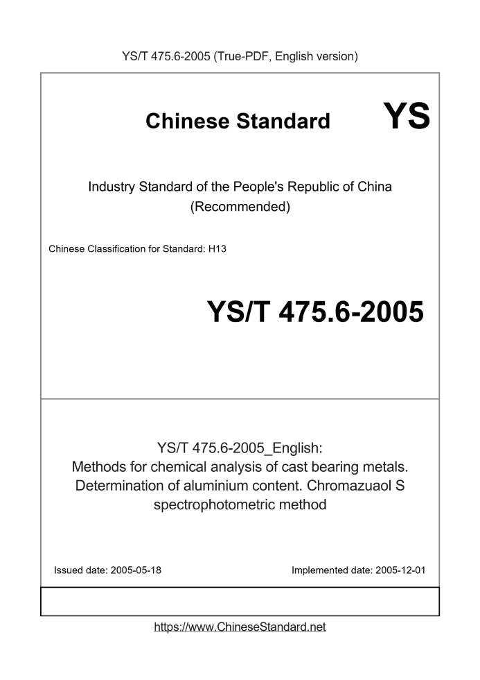 Delivery: <= 3 days. True-PDF full-copy in English will be manually translated and delivered via email. YS/T 475.6-2005: Methods for chemical analysis of cast bearing metals. Determination of aluminium content. Chromazuaol S spectrophotometric method Status: Valid