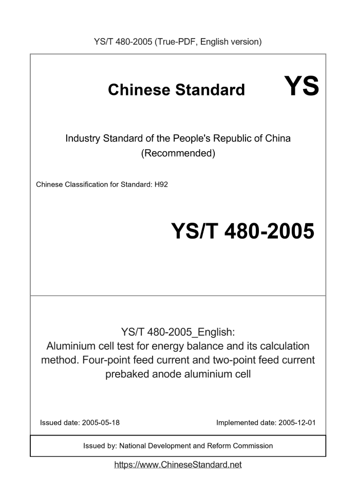 Delivery: <= 5 days. True-PDF full-copy in English will be manually translated and delivered via email. YS/T 480-2005: Aluminium cell test for energy balance and its calculation method. Four-point feed current and two-point feed current prebaked anode aluminium cell Status: Valid