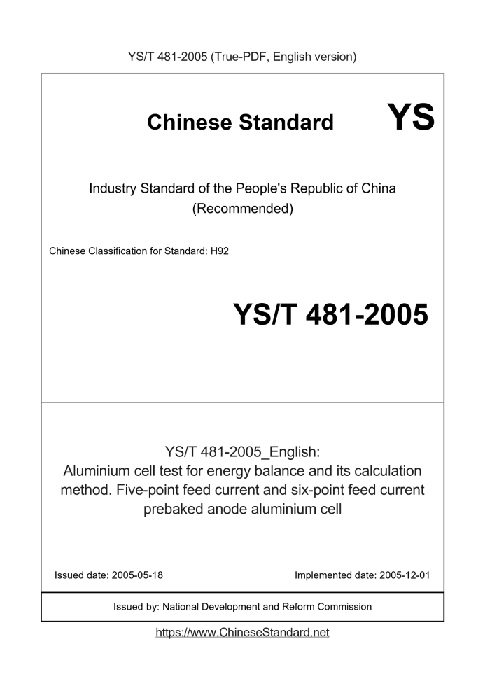 Delivery: <= 5 days. True-PDF full-copy in English will be manually translated and delivered via email. YS/T 481-2005: Aluminium cell test for energy balance and its calculation method. Five-point feed current and six-point feed current prebaked anode aluminium cell