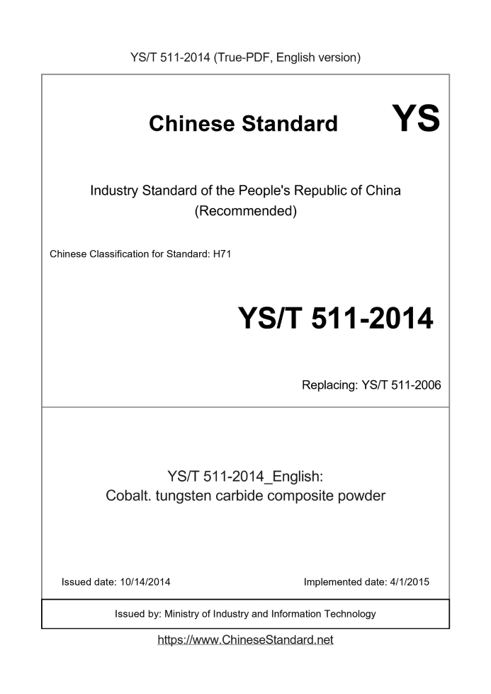 Delivery: <= 3 days. True-PDF full-copy in English will be manually translated and delivered via email. YS/T 511-2014: Cobalt. tungsten carbide composite powder Status: Valid YS/T 511: Historical versions