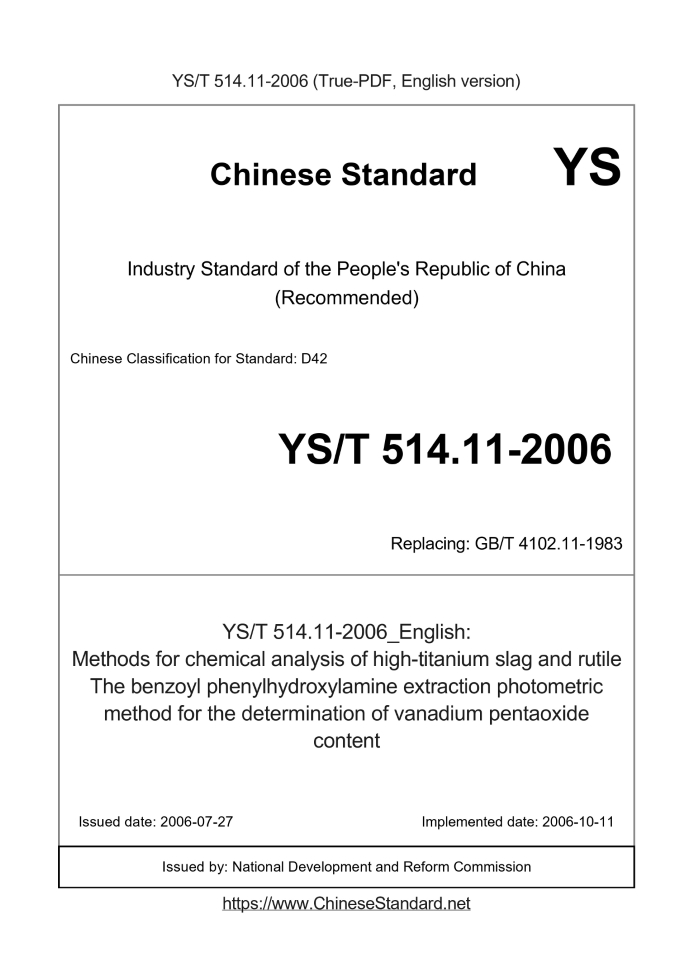Basic dataStandard ID: YS/T 514.11-2006 (YS/T514.11-2006)Description (Translated English): Methods for chemical analysis of high-titanium slag and rutile The benzoyl phenylhydroxylamine extraction photometric method for the determination of vanadium pentaoxide content Sector / Industry: Nonferrous Metallurgy Industry Standard (Recommended) Classification of Chinese Standard: D42 Classification of International Standard: 73.060 Word Count Estimation: 3,320 Date of Issue: 2006-07-27 Date of Implementation: 2006-10-11 Older Standard (superseded by this standard): GB/T 4102.11-1983 Regulation (derived from): ?Development and Reform Commission Announcement 2006 No.46; Industry-Science [2009] No.66 Issuing agency(ies): National Development and Reform Commission Summary: This standard applies to high titanium slag, determination of the amount of rutile vanadium pentoxide. Measuring range: 0. 02 to 0. 50%. Compliance with this standard GB 1467-1978 "Methods for chemical analysis of metallurgical products standard General rules and regulations. " Tips & Frequently Asked Questions:Question 1: How long will the true-PDF of YS/T 514.11-2006_English be delivered?Answer: Upon your order, we will start to translate YS/T 514.11-2006_English as soon as possible, and keep you informed of the progress. The lead time is typically in 9 seconds (download/delivered in 9 seconds). The lengthier the document the longer the lead time.Question 2: Can I share the purchased PDF of YS/T 514.11-2006_English with my colleagues?Answer: Yes. The purchased PDF of YS/T 514.11-2006_English will be deemed to be sold to your employer/organization who actually pays for it, including your colleagues and your employer's intranet.Question 3: Does the price include tax/VAT?Answer: Yes. Our tax invoice, downloaded/delivered in 9 seconds, includes all tax/VAT and complies with 100+ countries' tax regulations (tax exempted in 100+ countries) -- See Avoidance of Double Taxation Agreements (DTAs): List of DTAs signed between Singapore and 100+ countriesQuestion 4: Do you accept my currency other than USD?Answer: Yes. If you need your currency to be printed on the invoice, please write an email to Sales@ChineseStandard.net. In 2 working-hours, we will create a special link for you to pay in any currencies. Otherwise, follow the normal steps: Add to Cart -- Checkout -- Select your currency to pay. |