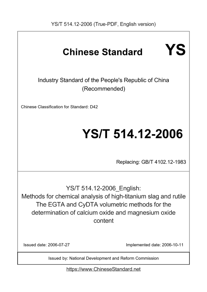 Basic dataStandard ID: YS/T 514.12-2006 (YS/T514.12-2006)Description (Translated English): Methods for chemical analysis of high-titanium slag and rutile The EGTA and CyDTA volumetric methods for the determination of calcium oxide and magnesium oxide content Sector / Industry: Nonferrous Metallurgy Industry Standard (Recommended) Classification of Chinese Standard: D42 Classification of International Standard: 73.060 Word Count Estimation: 4,491 Date of Issue: 2006-07-27 Date of Implementation: 2006-10-11 Older Standard (superseded by this standard): GB/T 4102.12-1983 Regulation (derived from): ?Development and Reform Commission Announcement 2006 No.46; Industry-Science [2009] No.66 Issuing agency(ies): National Development and Reform Commission Summary: This standard applies to high titanium slag, determination of rutile in the amount of calcium oxide and magnesium oxide. Measuring range: 0. 20 to 5. 00% calcium oxide, magnesium 0. 20 to 15. 00%. Compliance with this standard GB 1467-1978 "Methods for chemical analysis of metallurgical products standard General rules and regulations. " Tips & Frequently Asked Questions:Question 1: How long will the true-PDF of YS/T 514.12-2006_English be delivered?Answer: Upon your order, we will start to translate YS/T 514.12-2006_English as soon as possible, and keep you informed of the progress. The lead time is typically in 9 seconds (download/delivered in 9 seconds). The lengthier the document the longer the lead time.Question 2: Can I share the purchased PDF of YS/T 514.12-2006_English with my colleagues?Answer: Yes. The purchased PDF of YS/T 514.12-2006_English will be deemed to be sold to your employer/organization who actually pays for it, including your colleagues and your employer's intranet.Question 3: Does the price include tax/VAT?Answer: Yes. Our tax invoice, downloaded/delivered in 9 seconds, includes all tax/VAT and complies with 100+ countries' tax regulations (tax exempted in 100+ countries) -- See Avoidance of Double Taxation Agreements (DTAs): List of DTAs signed between Singapore and 100+ countriesQuestion 4: Do you accept my currency other than USD?Answer: Yes. If you need your currency to be printed on the invoice, please write an email to Sales@ChineseStandard.net. In 2 working-hours, we will create a special link for you to pay in any currencies. Otherwise, follow the normal steps: Add to Cart -- Checkout -- Select your currency to pay. |