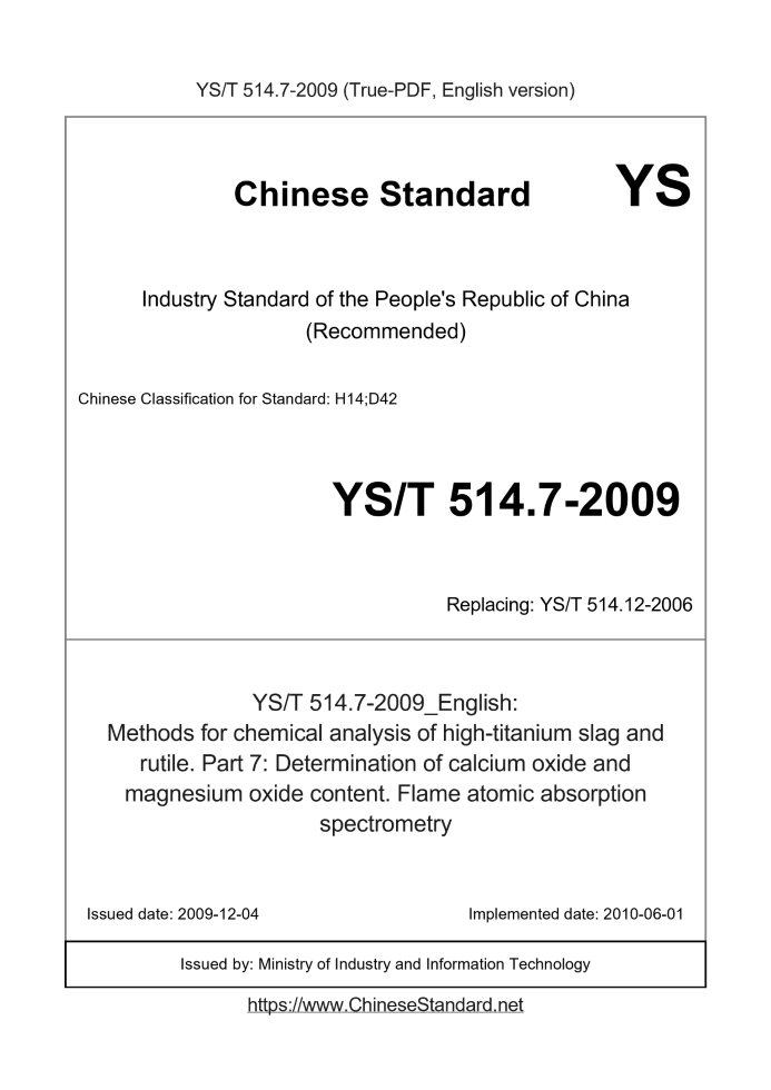 Delivery: <= 3 days. True-PDF full-copy in English will be manually translated and delivered via email. YS/T 514.7-2009: Methods for chemical analysis of high-titanium slag and rutile. Part 7: Determination of calcium oxide and magnesium oxide content. Flame atomic absorption spectrometry YS/T 514.7: Historical versions