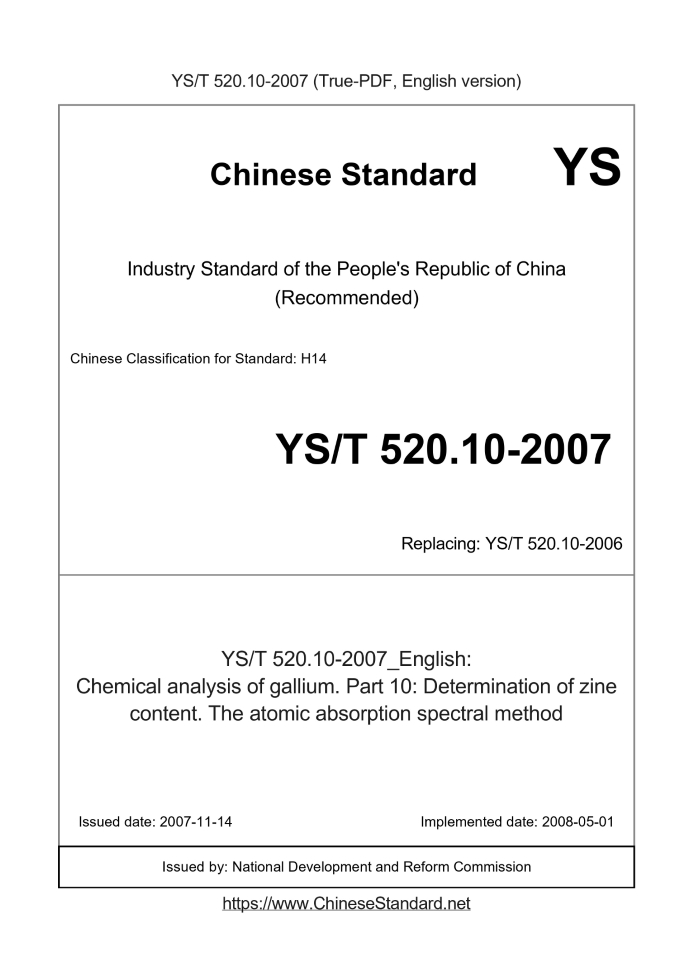 Chemical analysis of gallium.Part 10. Determination of zine content.The atomic absorption spectral method ICS 77.120.70 H14 People's Republic of China Nonferrous Metals Industry Standard Replacing YS/T 520.10-2006 Chemical analysis of gallium Part 10. Determination of zinc content Atomic Absorption Spectrometry Posted 2007-11-14 2008-05-01 implementation National Development and Reform Commission issued