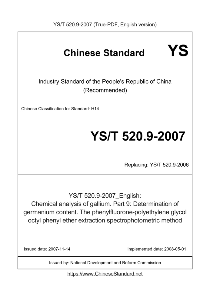 Delivery: <= 3 days. True-PDF full-copy in English will be manually translated and delivered via email. YS/T 520.9-2007: Chemical analysis of gallium. Part 9: Determination of germanium content. The phenylfluorone-polyethylene glycol octyl phenyl ether extraction spectrophotometric method YS/T 520.9: Historical versions