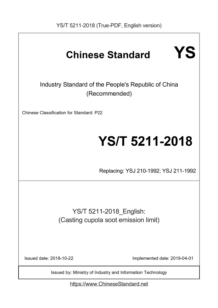 Delivery: <= 7 days. True-PDF full-copy in English will be manually translated and delivered via email. YS/T 5211-2018: (Casting cupola soot emission limit) Status: Valid