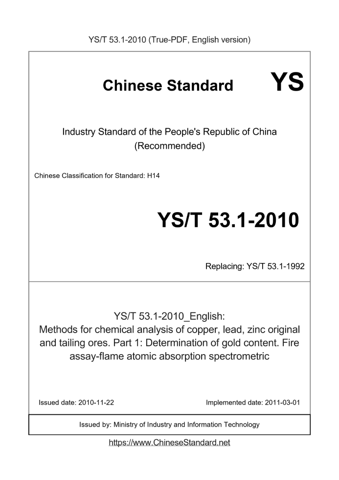 Delivery: <= 3 days. True-PDF full-copy in English will be manually translated and delivered via email. YS/T 53.1-2010: Methods for chemical analysis of copper, lead, zinc original and tailing ores. Part 1: Determination of gold content. Fire assay-flame atomic absorption spectrometric Status: Valid YS/T 53.1: Historical versions