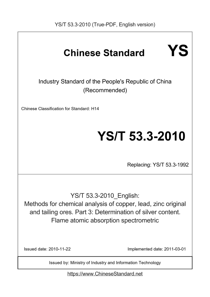 Delivery: <= 3 days. True-PDF full-copy in English will be manually translated and delivered via email. YS/T 53.3-2010: Methods for chemical analysis of copper, lead, zinc original and tailing ores. Part 3: Determination of silver content. Flame atomic absorption spectrometric Status: Valid YS/T 53.3: Historical versions