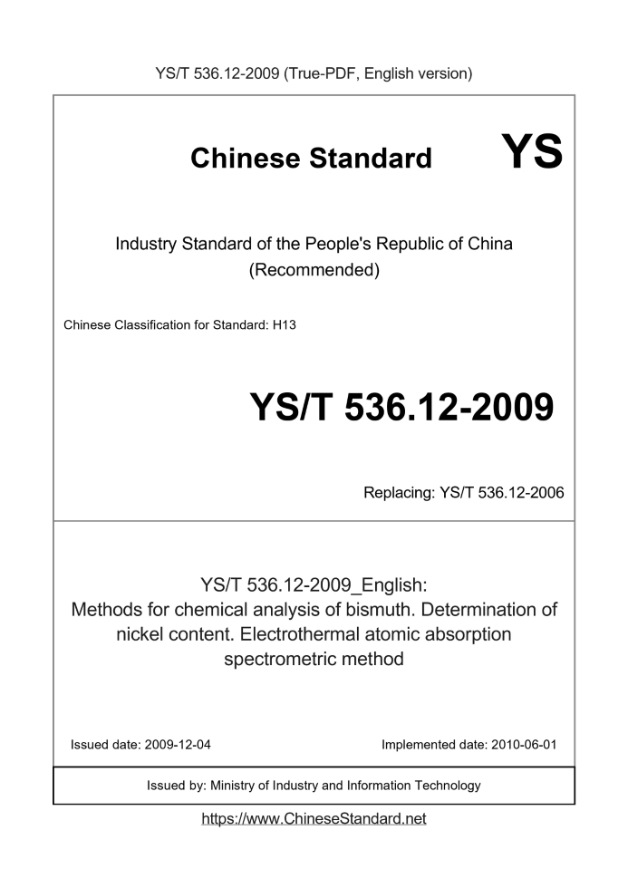 Delivery: <= 3 days. True-PDF full-copy in English will be manually translated and delivered via email. YS/T 536.12-2009: Methods for chemical analysis of bismuth. Determination of nickel content. Electrothermal atomic absorption spectrometric method Status: Valid YS/T 536.12: Historical versions