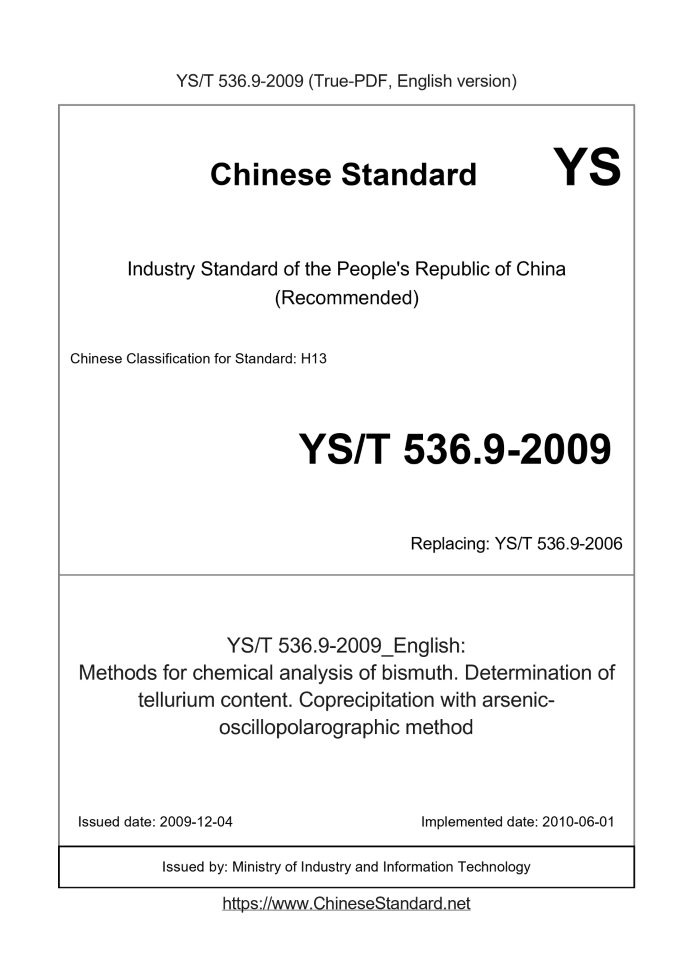 Methods for chemical analysis of bismuth.Determination of tellurium content.Coprecipitation with arsenic-oscillopolarographic method ICS 77.120.70 H13 People's Republic of China Nonferrous Metals Industry Standard Replacing YS/T 536.9-2006 Methods for chemical analysis of bismuth Determination of the amount of arsenic tellurium coprecipitation - oscillopolarographic method Posted 2009-12-04 2010-06-01 implementation Ministry of Industry and Information Technology of the People's Republic of China released