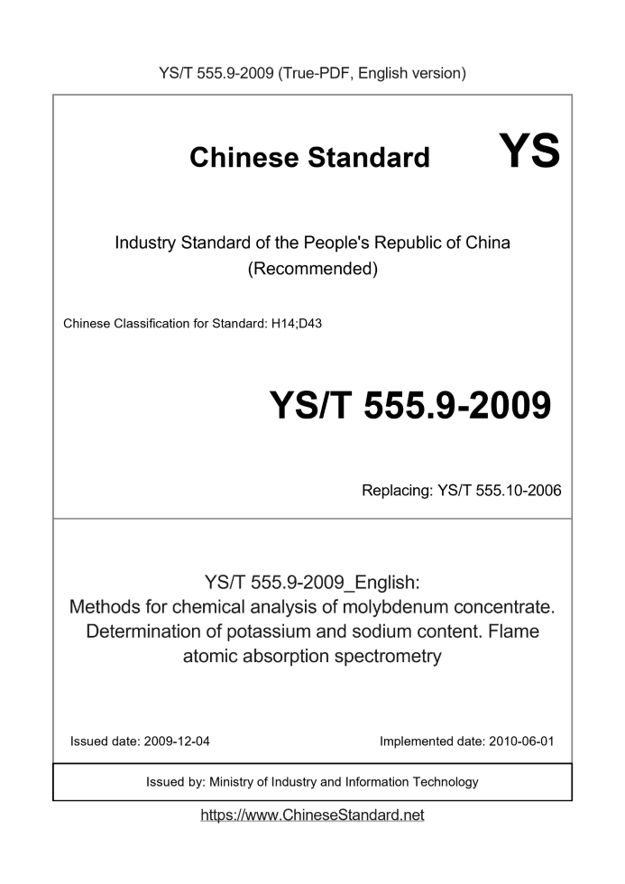 Delivery: <= 3 days. True-PDF full-copy in English will be manually translated and delivered via email. YS/T 555.9-2009: Methods for chemical analysis of molybdenum concentrate. Determination of potassium and sodium content. Flame atomic absorption spectrometry Status: Valid YS/T 555.9: Historical versions