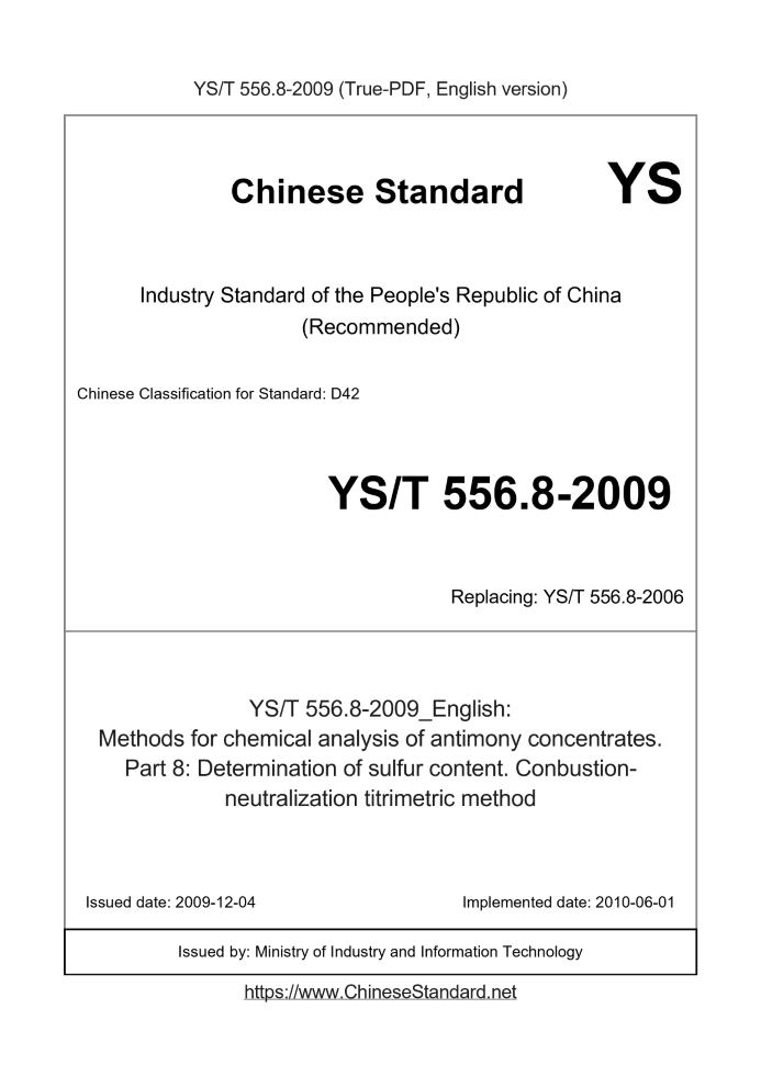 Delivery: <= 3 days. True-PDF full-copy in English will be manually translated and delivered via email. YS/T 556.8-2009: Methods for chemical analysis of antimony concentrates. Part 8: Determination of sulfur content. Conbustion-neutralization titrimetric method Status: Valid YS/T 556.8: Historical versions