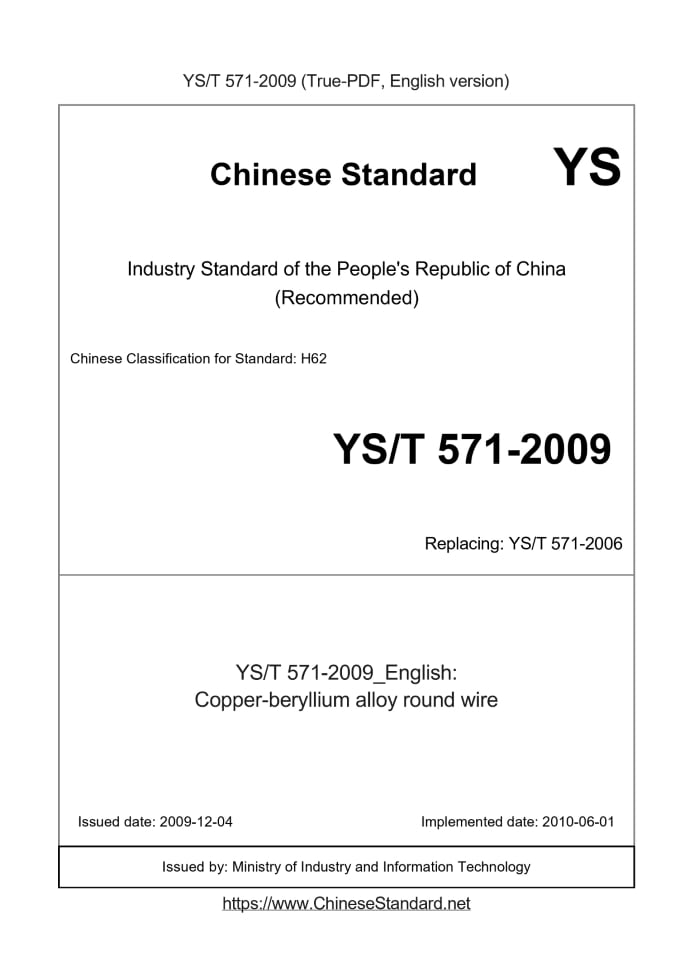 Delivery: <= 3 days. True-PDF full-copy in English will be manually translated and delivered via email. YS/T 571-2009: Copper-beryllium alloy round wire Status: Valid YS/T 571: Historical versions