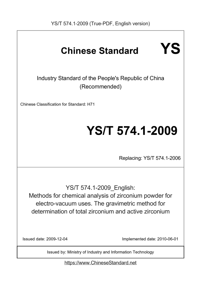 Delivery: <= 2 days. True-PDF full-copy in English will be manually translated and delivered via email. YS/T 574.1-2009: Methods for chemical analysis of zirconium powder for electro-vacuum uses. The gravimetric method for determination of total zirconium and active zirconium Status: Valid YS/T 574.1: Historical versions