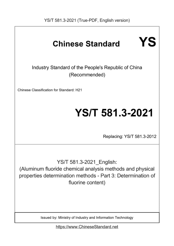 Delivery: <= 3 days. True-PDF full-copy in English will be manually translated and delivered via email. YS/T 581.3-2021: (Aluminum fluoride chemical analysis methods and physical properties determination methods - Part 3: Determination of fluorine content) Status: Valid YS/T 581.3: Historical versions