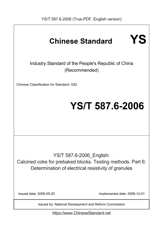 Delivery: <= 3 days. True-PDF full-copy in English will be manually translated and delivered via email. YS/T 587.6-2006: Calcined coke for prebaked blocks. Testing methods. Part 6: Determination of electrical resistivity of granules Status: Valid
