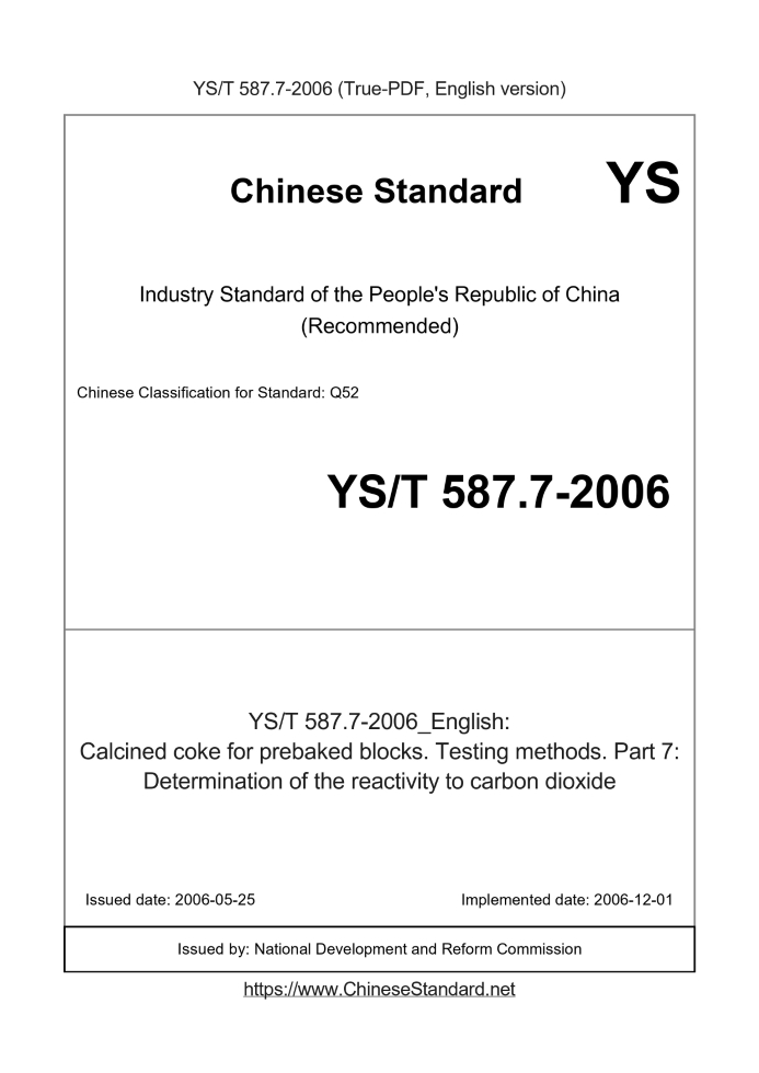 Delivery: <= 3 days. True-PDF full-copy in English will be manually translated and delivered via email. YS/T 587.7-2006: Calcined coke for prebaked blocks. Testing methods. Part 7: Determination of the reactivity to carbon dioxide Status: Valid