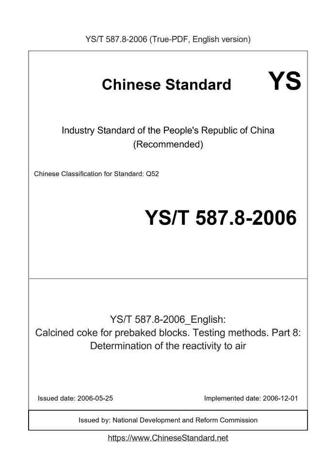 Delivery: <= 3 days. True-PDF full-copy in English will be manually translated and delivered via email. YS/T 587.8-2006: Calcined coke for prebaked blocks. Testing methods. Part 8: Determination of the reactivity to air