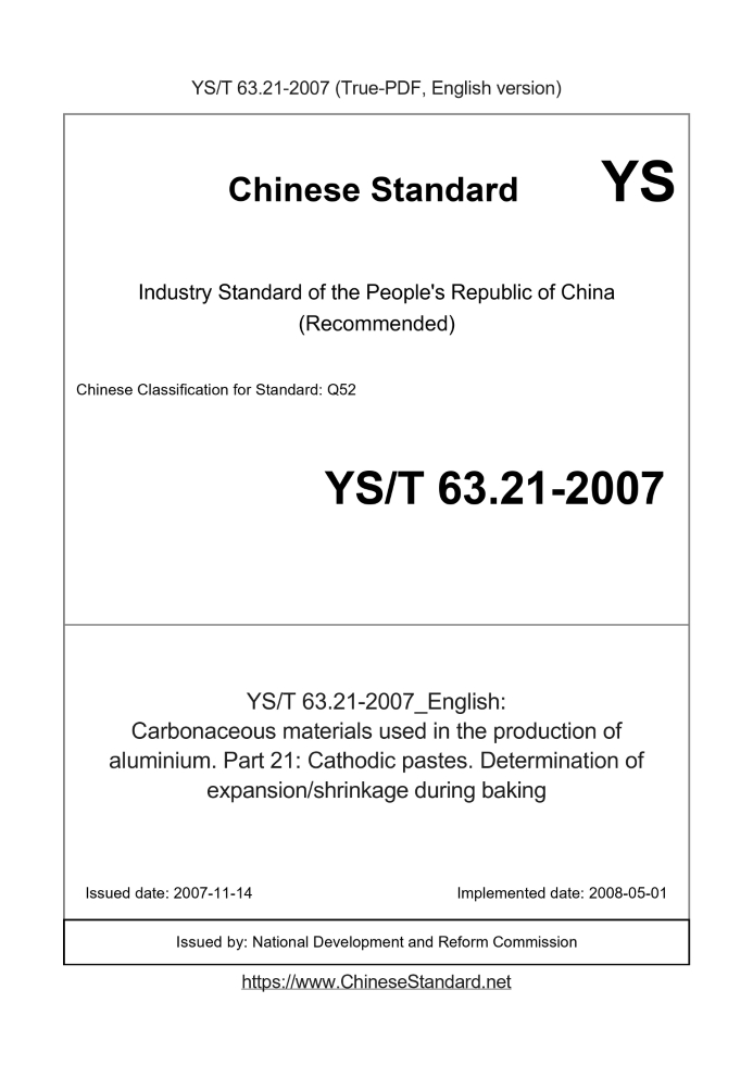 Delivery: <= 3 days. True-PDF full-copy in English will be manually translated and delivered via email. YS/T 63.21-2007: Carbonaceous materials used in the production of aluminium. Part 21: Cathodic pastes. Determination of expansion/shrinkage during baking Status: Valid