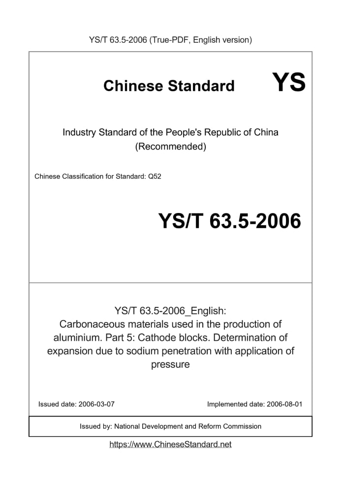 Delivery: <= 3 days. True-PDF full-copy in English will be manually translated and delivered via email. YS/T 63.5-2006: Carbonaceous materials used in the production of aluminium. Part 5: Cathode blocks. Determination of expansion due to sodium penetration with application of pressure Status: Valid