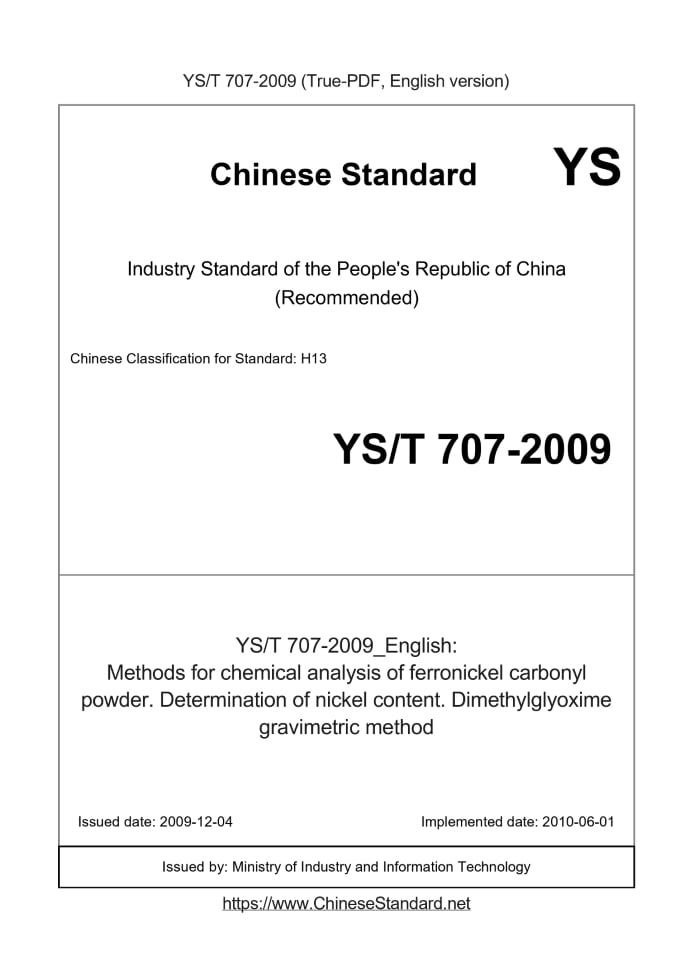 Delivery: <= 3 days. True-PDF full-copy in English will be manually translated and delivered via email. YS/T 707-2009: Methods for chemical analysis of ferronickel carbonyl powder. Determination of nickel content. Dimethylglyoxime gravimetric method