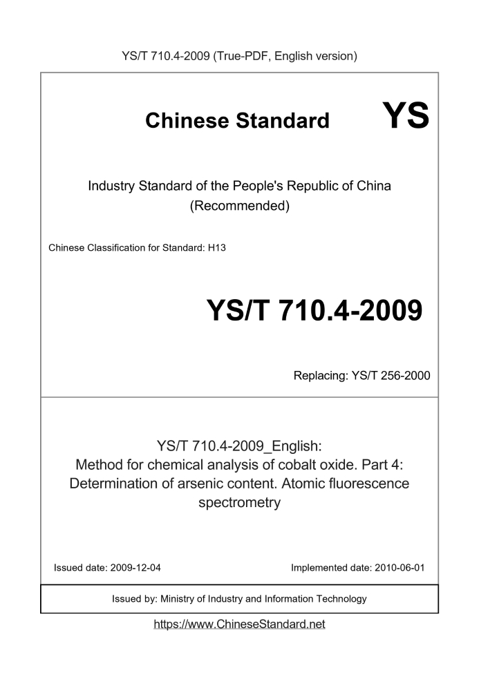 Delivery: <= 3 days. True-PDF full-copy in English will be manually translated and delivered via email. YS/T 710.4-2009: Method for chemical analysis of cobalt oxide. Part 4: Determination of arsenic content. Atomic fluorescence spectrometry Status: Valid