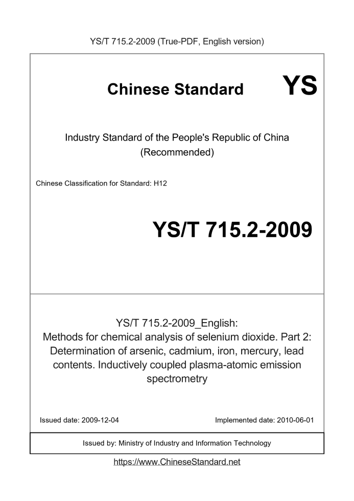 Delivery: <= 3 days. True-PDF full-copy in English will be manually translated and delivered via email. YS/T 715.2-2009: Methods for chemical analysis of selenium dioxide. Part 2: Determination of arsenic, cadmium, iron, mercury, lead contents. Inductively coupled plasma-atomic emission spectrometry Status: Valid