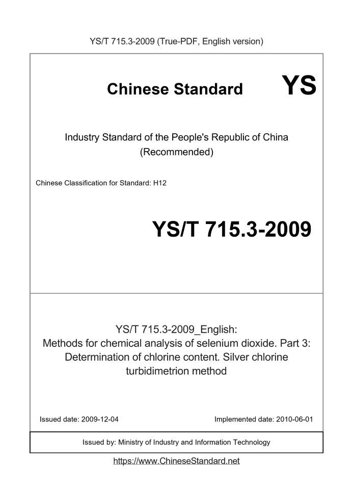 Delivery: <= 3 days. True-PDF full-copy in English will be manually translated and delivered via email. YS/T 715.3-2009: Methods for chemical analysis of selenium dioxide. Part 3: Determination of chlorine content. Silver chlorine turbidimetrion method Status: Valid